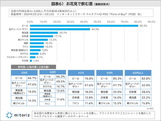 お花見でお酒を飲むと回答した957人を対象に「お花見で飲む酒」を調査したところ、「ビール(80.3%)」が8割を超え、圧倒的な人気となりました。以下「缶チューハイ・サワー(44.5%)」「発泡酒(20.7%)」「日本酒(17.1)」と続いています。世代別でも全世代で「ビール」「缶チューハイ・サワー」の上位2つは変わりませんが、ビールは世代が上がるに連れ、選択率が高くなっています。梅酒などの果実酒は20代では3位はいるなど若い世代では上位に入っている一方で、日本酒は逆に世代が上がるにつれて順位を上げており、60代以上では3位に入っており、世代ごとの特徴がみて取れます(図表6)。