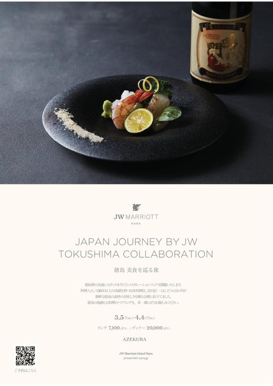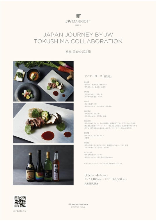 ・メニューは、足赤海老や鳴門鯛、ハリイカなど旬の魚を使った鮮魚に、えぐみのない徳島産ケールを添えたユニークなお造りや、噛むほどに旨みが溢れる徳島県産のブランド椎茸「天恵茹(てんけいこ)」、徳島県産黒毛和牛「阿波牛」の炙りを添えたお肉料理など、この期間でしか味わうことのできないメニューとなっており、徳島県産の地酒もご用意します。