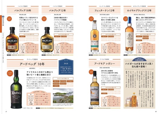スキットルに入れたウイスキーをアウトドアで楽しむ提案や、ハイボール缶の最新事情など、ミニコラムも充実。歴史から製造方法、ラベルの読み方、保存方法、バーでの楽しみ方にいたるまで、知っておきたいウイスキーの基礎知識もしっかりと解説しています。