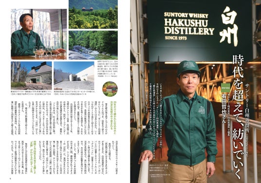 巻頭特集では、多くのファンに愛されるシングルモルトウイスキー「白州」のふるさと「サントリー白州蒸溜所」を探訪。大自然の中でウイスキー造りに携わる工場長の有田哲也さんにその哲学や思いを伺いました。