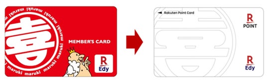本サービス開始に合わせ、丸喜はこれまで楽天Edyと提携し発行していたIC型電子マネー「まるきEdyカード」から、「楽天Edy」機能と共通ポイントサービス「楽天ポイントカード」を搭載したオリジナルデザイン「まるき楽天ポイントカード」への切り替えを行います(注4)。これにより利用者は、対象店舗にて、「まるき楽天ポイントカード」をはじめとする「楽天ポイントカード」、もしくは「楽天ポイントカード」機能が搭載されたアプリ、または「楽天カード」裏面のバーコード(注 5)を提示すると、利用金額に応じて「楽天ポイント」を貯めることができ、貯まったポイントを支払い時に使用することも可能になります。また、「楽天Edy」で支払いをすると、利用金額に応じて「楽天ポイント」が進呈されます。
