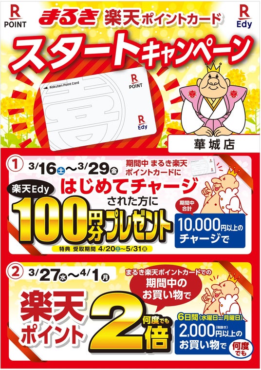 本サービス開始を記念して2024年3月16日(土)から4月28日(日)まで、「Edyはじめてチャージキャンペーン」を実施します(注6)。本キャンペーンでは、期間中に対象店舗に設置されたチャージ機で「まるき楽天ポイントカード」に合計10,000円以上を初めてチャージした方にもれなく「楽天Edyギフト」を100円分進呈します。また、2024年3月27日(水)から4月29日(月)まで「まるき楽天ポイントカード」を提示して、2,000円(税抜)以上会計すると、「楽天ポイント」を2倍進呈する「楽天ポイント2倍キャンペーン」を実施します(注7)。