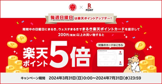 さらに、2024年3月31日(日)から7月31日(水)まで、「まるき 日曜日は楽天ポイント5倍」キャンペーンを実施します。本キャンペーンは、開催期間中の日曜日に「まるき楽天ポイントカード」を提示して、200円(税抜)以上会計すると、「楽天ポイント」を5倍進呈します。