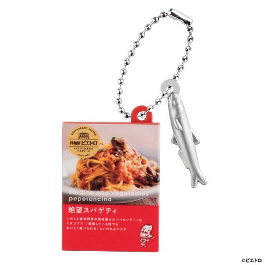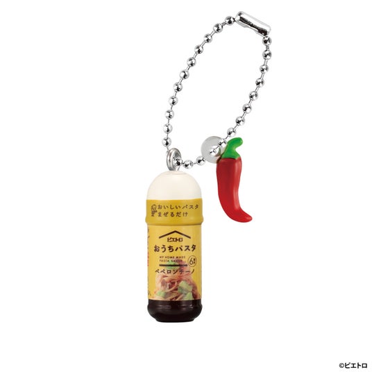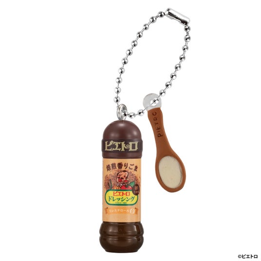 本商品は、ピエトロが販売している定番のドレッシングやパスタソースを、約35~40mm(ボールチェーンの穴及びボールチェーン含まず) のミニチュアのサイズにしたチャームです。ピエトロドレッシングからは、和風しょうゆ、グリーン 和風しょうゆ、焙煎香りごまがラインナップ。おうちパスタからは、ごま醤油ガーリック、ぺぺーロンチーノ、また、洋麺屋ピエトロ パスタソース絶望スパゲティを合わせた全6種をラインナップ。それぞれの特徴的なモチーフも付いた、ダブルスイング仕様となります。