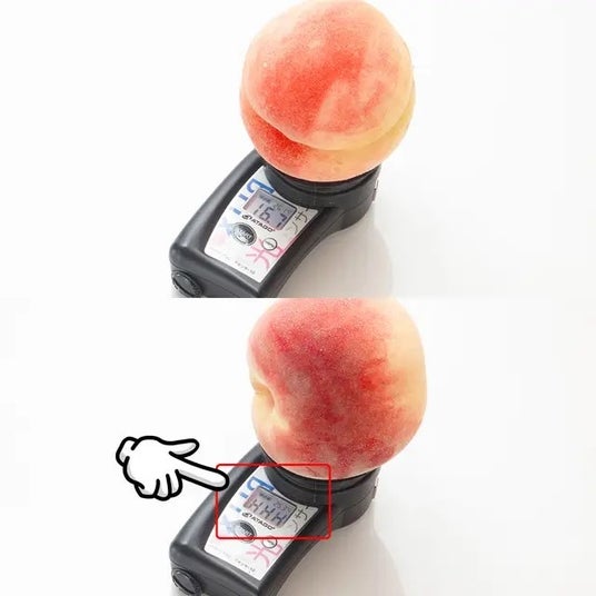糖度計測時の写真規格外の糖度!画像は非破壊糖度計(果物を傷つけず糖が赤外線を当てた時に特定の波長の光を吸収する原理を利用)での糖度測定の画像です。上の弊社農園栽培桃の糖度が16.7度の高い糖度を示していますが、新品種桃は更に高く、測定範囲を上回る測定値の果実を測定した際に表示される値『HHH』が表示されています。