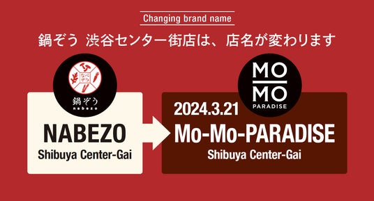 2024年3月21日(木)、株式会社ワンダーテーブル(本社:東京都新宿区西新宿、代表取締役社長:河野 博明)は、しゃぶしゃぶ・すき焼き「鍋ぞう 渋谷センター街店」の店名を「モーモーパラダイス 渋谷センター街店」へ変更したことをお知らせします。