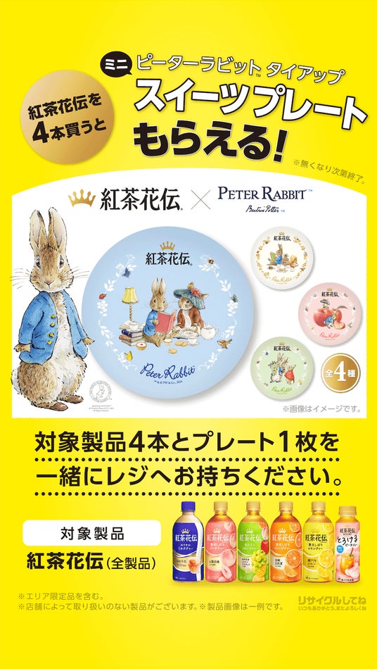 3月25日(月)から、対象製品である「紅茶花伝」(※エリア限定品を含む)などを対象店舗で4本お買い上げいただくと、「ピーターラビット(TM)」とコラボしたミニスイーツプレートがもらえます。