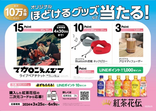 3月 25 日(月) から 6 月 9日(日) まで 、 「紅茶花伝」(※エリア限定品を含む)を ご購入いただき、パッケージに記載の二次元コードを撮影し専用サイトにて応募すると、 ご購入本数に応じて、「オリジナルほどけるグッズ」がその場で当たります。グッズラインナップには、「マカロニえんぴつ」ライブペアチケット(45組90名様)や、オリジナルBluetooth搭載ネックピロー(2カラー・40名様)、オリジナルアロマディフューザー(1,000名様)などをご用意しているほか、先着 10万名様は LINEポイント(10ポイント)が必ずもらえます。