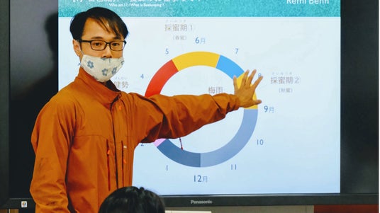 その後、生徒たちは「総合学習の学びを地域に発表する場」で「ミツバチについて学んだこと」をテーマにプレゼンテーションを実施しました。生徒たちは授業の内容をしっかりと吸収してくれ、「生徒の作ったプレゼン資料は、先生の手直しがいらないほど完成度の高いものだった」と先生よりコメントをいただきました。