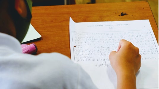 「2コマの授業」は「蜂蜜から見る、森と生き物のつながり」というテーマで実施。「ミツバチの知られざる生態」や、「自然界における役割」を、スライド投影を用いながら伝えました。「45分×2コマ・スライド140枚」という情報量ながら、子どもたちは最後まで授業に集中。びっしりとメモをとり、たくさんの質問をしてくれました。