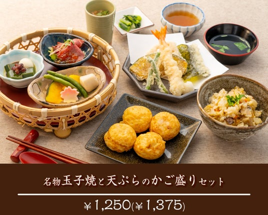 ・名物玉子焼 揚げたて天ぷら盛り 季節の炊き込みご飯 小鉢 お出汁 小さな甘味がついたかご盛りセット