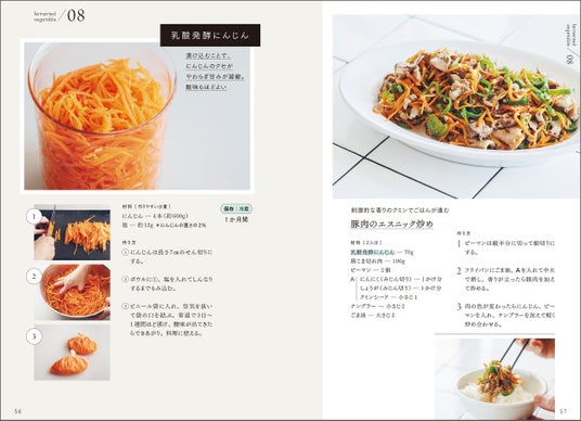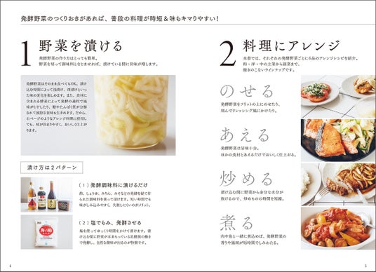 発酵野菜はそのまま食べてもOK。漬け込む時間によって浅漬け、しっかり漬けた深漬けなど味の変化を楽しめます。また、食材に含まれる酵素によって風味がUPしたり、糖やたんぱく質を分解発酵させることで独特な旨味成分も生まれます。だから、アレンジ料理に使用すると、味が決まりやすく、おいしく仕上がります。本書では、それぞれのつくりおき発酵野菜を使った6品のアレンジレシピを紹介。和・洋・中のバリエーションで主菜から副菜まで豊富にそろえたので、飽きずに活用できます。
