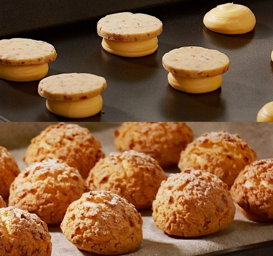 2)シュー生地の上に凍ったままのアーモンドクッキーC-5をのせ焼成します。