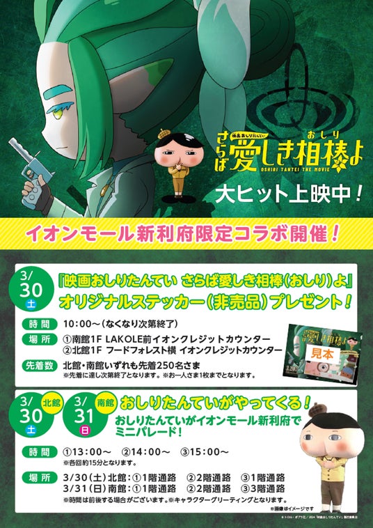 ・内 容:期間中は、専門店による特別セールを開催するほか、春物アイテムを取り揃え、皆さまをお出迎えします。また、『映画おしりたんてい さらば愛しき相棒(おしり)よ』とコラボしたイベントやノベルティプレゼント、おトクなクーポンや豪華賞品が当たる大抽選会も開催します。