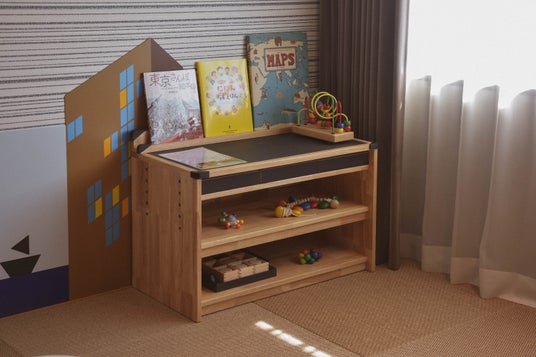 おもちゃの収納棚であるSHELFには、知育玩具アドバイザーがセレクトしたお子さまの発達にぴったりのおもちゃをセッティングしました。全てのおもちゃは、原材料や塗料に安全性が認められている製品を厳選しています。配置するMINORINOのSHELFもまた、指はさみ防止設計がなされるなど安全性が高く、天板のリノリウムは抗菌・抗ウイルス・脱臭効果を持ち清潔な環境を保てる仕様です。汚れから無垢材を守る塗料も、食品衛生法の基準に適合しており、乳児のいるご家族も安心してご使用いただけます。安全で楽しく、学びのあるおもちゃ棚を完備することは、旅行中のお父さん・お母さんの負担軽減にもつながります。どうぞ安心してお子さまたちの学びの時間をお楽しみください。