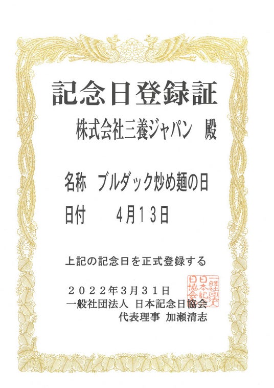■今年で発売から12周年!!4月13日は記念日「ブルダック炒め麺の日」です韓国発の激辛麺「ブルダック炒め麺」の美味しさと魅力を多くの方に知っていただくとともに、ブルダック炒め麺公式キャラクターのホチの誕生日でもある4月13日を皆様と共にお祝いしたいと考え、一般社団法人日本記念日協会より記念日の認定を受けました。