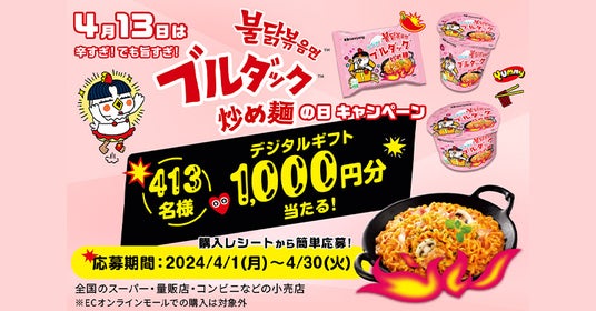 対象期間に発行されたブルダック炒め麺・カルボナーラシリーズの購入レシートを、お持ちのスマートフォンで撮影下さい。特設キャンペーンサイトでマイページを作成の上、レシート画像をアップロードし、ご応募いただけます。「ブルダック炒め麺の日」の4月13日にちなみ、抽選で413名様にデジタルギフト1000円分がその場で当たります。