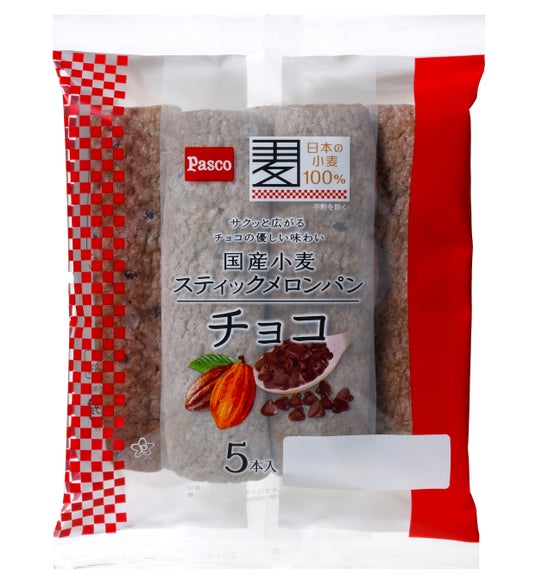 「国産小麦 スティックメロンパン チョコ5本入」は、国産小麦100%(手粉を除く)のパン生地にチョコクリームを折り込み、チョコチップ入りのクッキー生地をのせて焼き上げた、優しい味わいのメロンパンです。