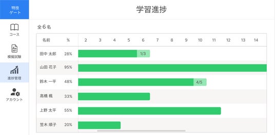特技ゲートでは、受講者の学習進捗を一覧で確認できます。そのため、マネージャーが受講者に学習を促すことができ、合格の可能性が高まります。