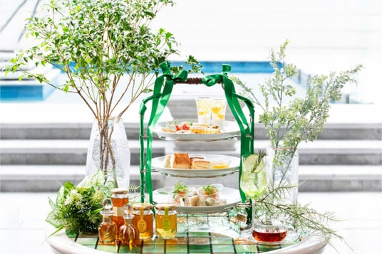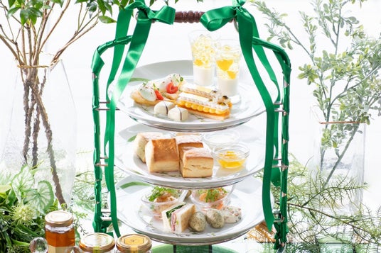 季節ごとにテーマや内容を変えて提供するラ・スイートのアフタヌーンティー。5月~6月は、はちみつを愉しむメニューをご用意いたします。緑をテーマカラーに、グリーンやステンドグラスをイメージした装飾、シーズナルドリンク「翠の輝き」で透明感のある爽やかな初夏を表現します。