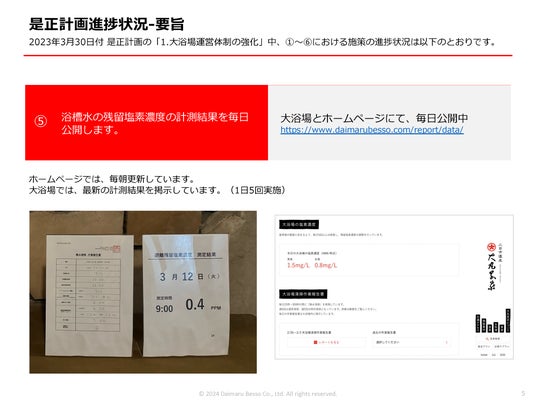 これらの情報(換水清掃の報告書、水質検査の結果、残留塩素濃度の数値)は、お客様がいつでもご覧になれるよう大浴場内に掲示するとともに、公式ウェブサイト上でも適宜公開しております。