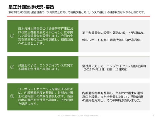 この是正計画は、引き続き弊社の最重要課題と位置付け、全社員が一丸となって取り組んでまいります。今後とも変わらぬご支援とご愛顧を賜りますようお願い申し上げます。