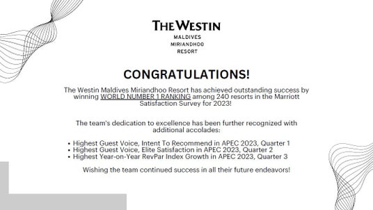 全世界240拠点のウェスティンホテルの中から、お客様の声や推奨意図、RevPar指数などさまざまな観点からの取り組みを高く評価していただき、1位を受賞することができました。今回の栄誉ある受賞は、ご宿泊いただいた皆様のご支持によるものでございます。今後も皆様にThe Westin Maldives Miriandhoo Resortでのご滞在をお楽しみいただけるよう、日々精進してまいります。