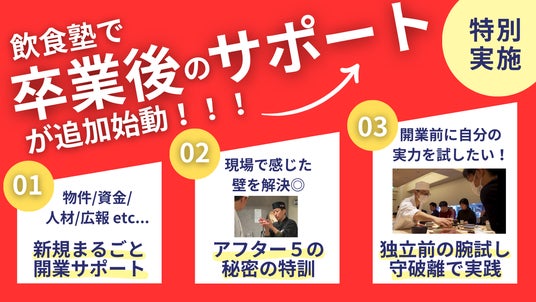 超短期実践の料理人育成スクール「飲食塾」では、独立開業等を志す方の夢を応援するべく、卒業後のサポートを強化することといたしました。