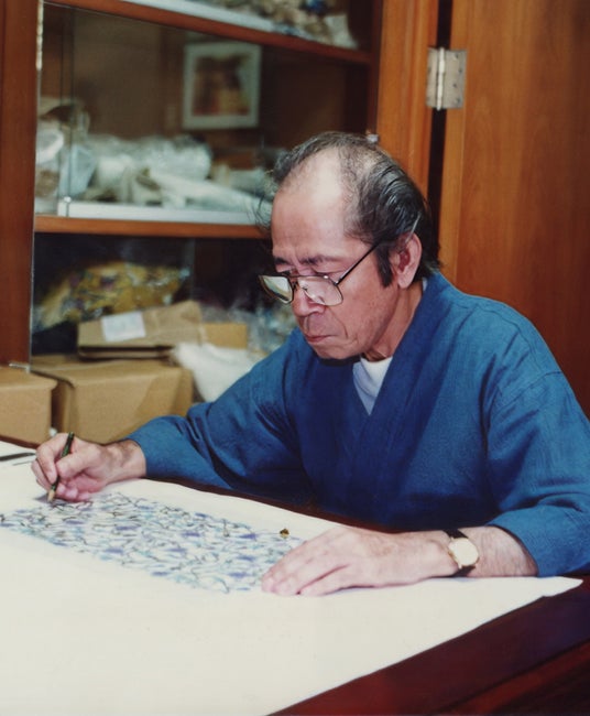 玉那覇有公氏は那覇市首里に工房を構え、1996年に国の重要無形文化財保持者(人間国宝)に認定されました。緻密で力強い作風で知られ、両面染めを行う唯一の作家です。本展では9点(3月25日時点)の作品を展示販売しております。