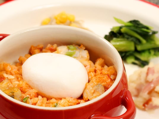 トマトリゾットにもう一声の気持ちで、とろりと黄身が流れる半熟卵を添えています。家庭では少し難しい一手間が気軽に食べれるプレートに仕上がっています。レンチンしても半熟な卵がポイントです。
