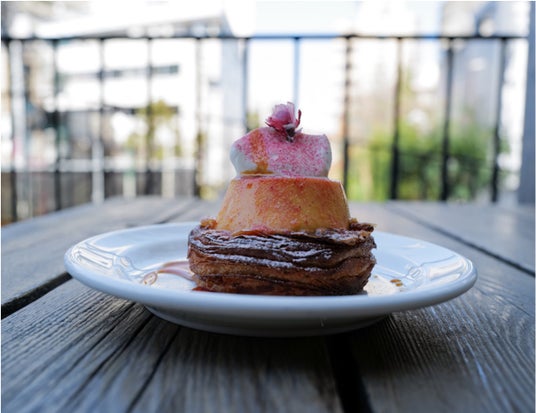 16層に折り込まれたバターの香るクロワッサン生地で作る、GHCの人気商品「エッグタルト」を特別に2倍サイズの大きさにしました。そこに存在感たっぷりなクラシックプリンを乗せることで、クロワッサン生地のバリバリな食感と、プリンのぷるんぷるんでもっちりとした食感を同時にお楽しみいただけます。甘さのあるアパレイユを引き立てるため、プリンはあえてシンプルな味に仕立てています。お好みでほろ苦いカラメルをかけることで、さらに味の奥行き感を演出します。プリンの上には、生クリームと桜パウダー、桜の花びらをあしらうことで華やかな春の装いに仕上げています。