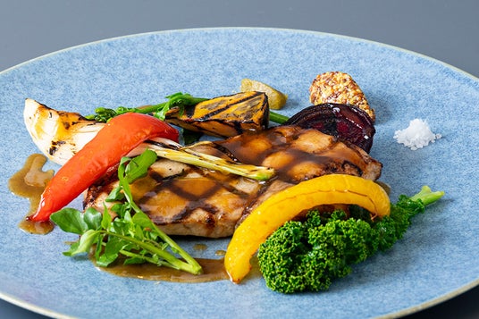 諫早産諫美豚ロースのシンプルな網焼き 五島灘の潮、粒マスタード、柚子胡椒添え
