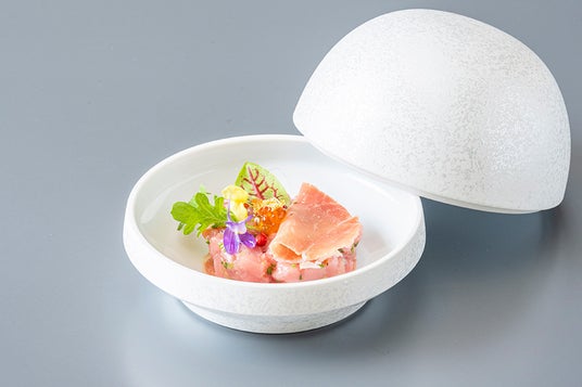 長崎産養殖マグロのタルタルと生ハム 五島産椿オイル風味