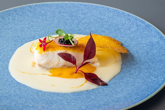 五島産養殖クエのスチーム カラスミ風味 人参とオレンジのピューレ添え ブールブランソース