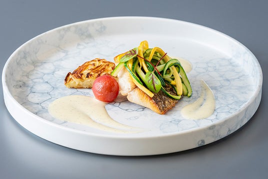 五島産イサキのポアレ じゃが芋のガレットとズッキーニのヌイユ添え 大和バニラビーンズ風味のブールブランソース