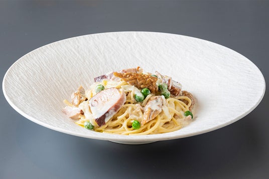 アラカルトでは、五島うどんと同じ製法で作った手延べスパゲッティを使った3種のパスタが登場いたします。通常のパスタよりコシがあるのが特徴の麺に「島原産甲イカ」や「羽カツオの燻製」、「地鶏しまさざなみ」など長崎の食材を合わせました。