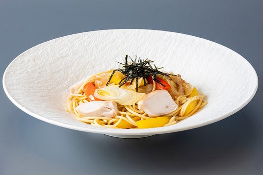 地鶏しまさざなみとパプリカの五島の醤を使った和風手延べスパゲッティ