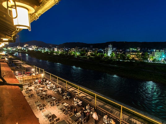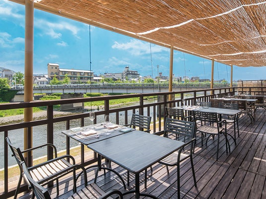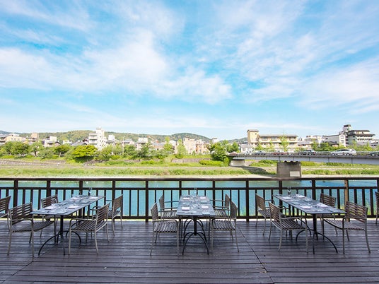 鴨川沿い最大級の開放的な川床席で京フレンチを堪能できる