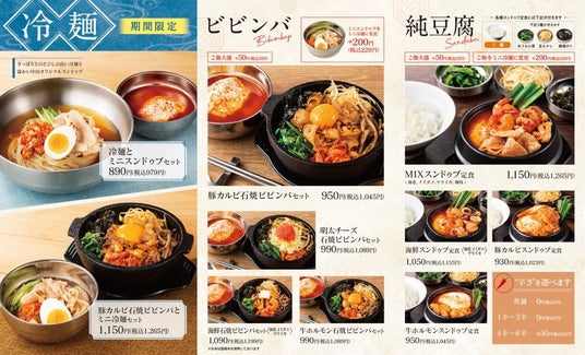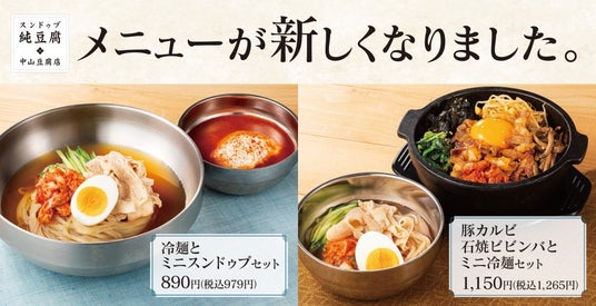 アークランドサービスホールディングス株式会社の子会社、「肉めし岡もと」などを運営する株式会社トビラダイニング(本社:東京都千代田区/代表:大内 勇一)は、スンドゥブ定食専門店「スンドゥブ 中山豆腐店」にて、春夏の定番「冷麺」や、「石焼ビビンバシリーズ」が仲間入りする新グランドメニューを2024年4月3日(水)より販売を開始いたします。