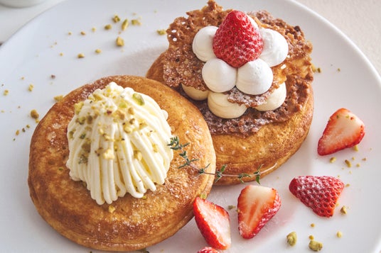 ひとつで二度おいしい!「生バターミルフィーユ」と「レアチーズモンブラン」の2種類の味わいが楽しめる、プレミアムなパンケーキ。生バターの香り高いコクとチーズのフレッシュな酸味が、“完熟紅ほっぺ”いちごの濃厚な甘さを引きたてます。