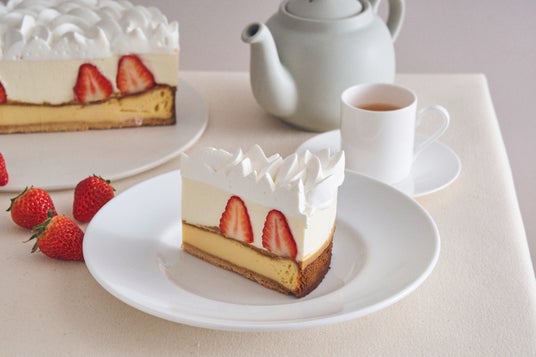 北海道産チーズの濃厚さが際だつ「ベイクドチーズケーキ」となめらかな「レアチーズケーキ」を2層仕立てに!チーズの酸味が“完熟紅ほっぺ”いちごの甘さをより一層引き立てます。コクのあるバタースコッチソースの中に隠し味のオレンジを。2つのチーズケーキが織りなすこっくりと濃厚な味わいをお楽しみください。