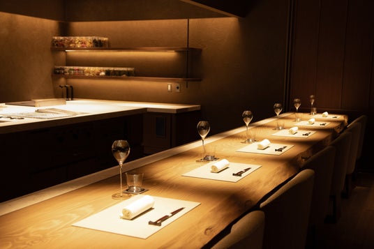 再開発が進む渋谷の街の喧騒から、高層階へと移動することで得られる静寂と高揚感を表現した光に包まれた空間。フロントを抜け、ほどなくすると現れる印象的な扉を開くと、そこに広がるのは、オープンで臨場感のあるキッチンと8席のカウンターと個室を備えた、シェフズテーブルのレストラン「FUSOU」です。