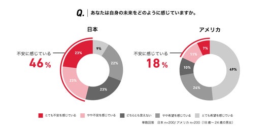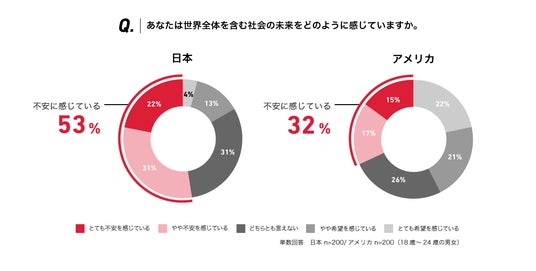 - 自身や社会の未来に対して不安を感じている次世代層の割合は、日本では約半数にのぼったが、アメリカでは3分の1以下となった