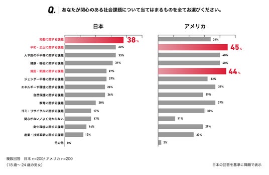 関心のある社会課題について聞いたところ、日本は「労働」への関心が最も高く、近年社会問題になっている長時間労働など働き方をめぐる課題が身近な関心事となっていることが分かりました。一方、アメリカでは「平和・公正に関する課題」が最も多く、次いで「貧困・飢餓に関する課題」と回答しました。