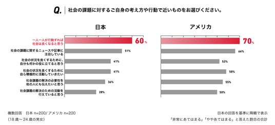 社会の課題に対する自身の考え方や行動で近いものについて聞いたところ、次世代層で日米ともに最も回答が多かったのは「一人一人が行動すれば社会は良くなると思う」で、日本では60%、アメリカで70%となりました。