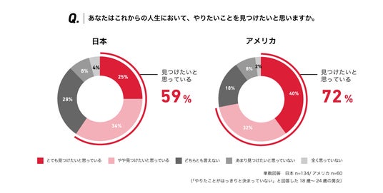 これからの人生においてやりたいことが「はっきりと決まっている」「やや決まっている」と回答した次世代層は、日本が30%に留まる一方、アメリカは70%と顕著な差がみられました。また、「まだやりたいことが見つかっていない」と回答した人でも、「将来やりたいことを見つけたい」と日本が59%、アメリカが72%回答しており、日米ともに自身の未来に対して意欲的に考えていることが明らかになりました。