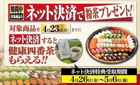 コロワイドグループの株式会社アトム(本社:神奈川県横浜市、代表取締役社長:小島保幸)は、「にぎりの徳兵衛」「海鮮アトム」「海へ」の各店で、2024年4月26日(金)~5月6日(祝) のお受取り限定で、2024年3月29日(金)~4月23日(火)までに対象のお持ち帰り商品をネット決済いただくと『健康四番茶(粉茶)』をプレゼントいたします。
