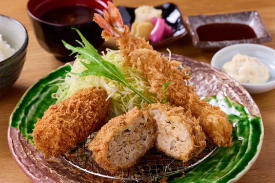 わさびおろしとの相性抜群な巧味豚ロースかつ御膳(160g 税抜2,900円、税込3,190円)や匠味豚ヒレかつ御膳(120g 税抜2,800円、税込3,080円)、ミックスフライ御膳(エビフライ、カニクリームコロッケ、塩メンチかつ)(税抜1,800円、税込1,980円)、三元豚ヒレかつ&カニクリームコロッケ御膳(税抜1,700円、税込1,870円)などのメニューをご用意しています。