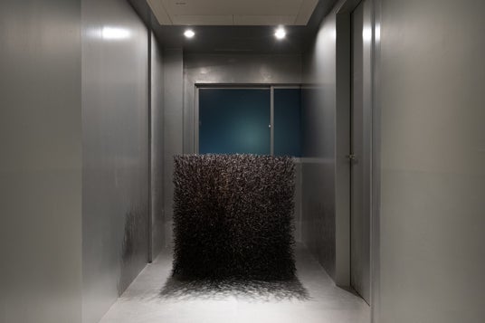 戸張さんの作品は、鉄の素材で出来ていて、細い鉄が無数に絡まり合うように立方体の形態をつくっています。植物の無軌道に繁茂していくようなエネルギーが乗り移っているような、不思議な生き物感があり、幾何学的な形態との対比が面白いですね。なんだが静かな狂気を感じられる作品でした。