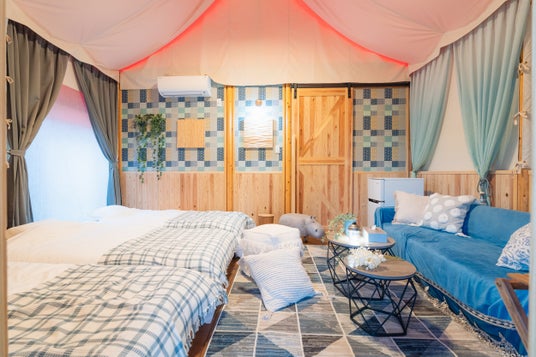 ホテルライクな内装は各お部屋ごとにテーマカラーを設定した快適なテントです。静かな山で鳥のさえずりに耳を澄ませる。そんな優雅な1日をお過ごしいただけるグランピング体験を完全無料でご案内。